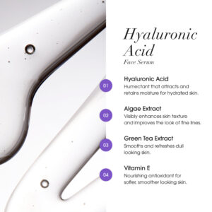 L’acide hyaluronique est un humectant, un mot sophistiqué désignant un ingrédient qui aide à retenir l’humidité. Le résultat? L’acide hyaluronique renouvelle si jeune votre peau que nous sommes inspirés de le renommer la fontaine de la jeunesse éternelle. Tout réside dans le maintien et la reconstitution de l’hydratation qu’offre l’acide hyaluronique. Enrichis d’aloès, d’extrait de pomme, de glycérine et d’algues rouges, ces ingrédients riches en nutriments contiennent des propriétés réparatrices qui transforment véritablement votre teint.
