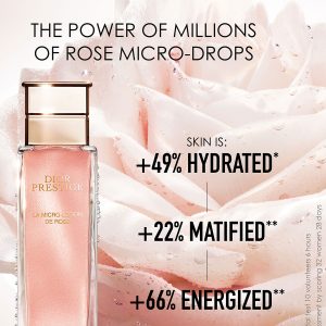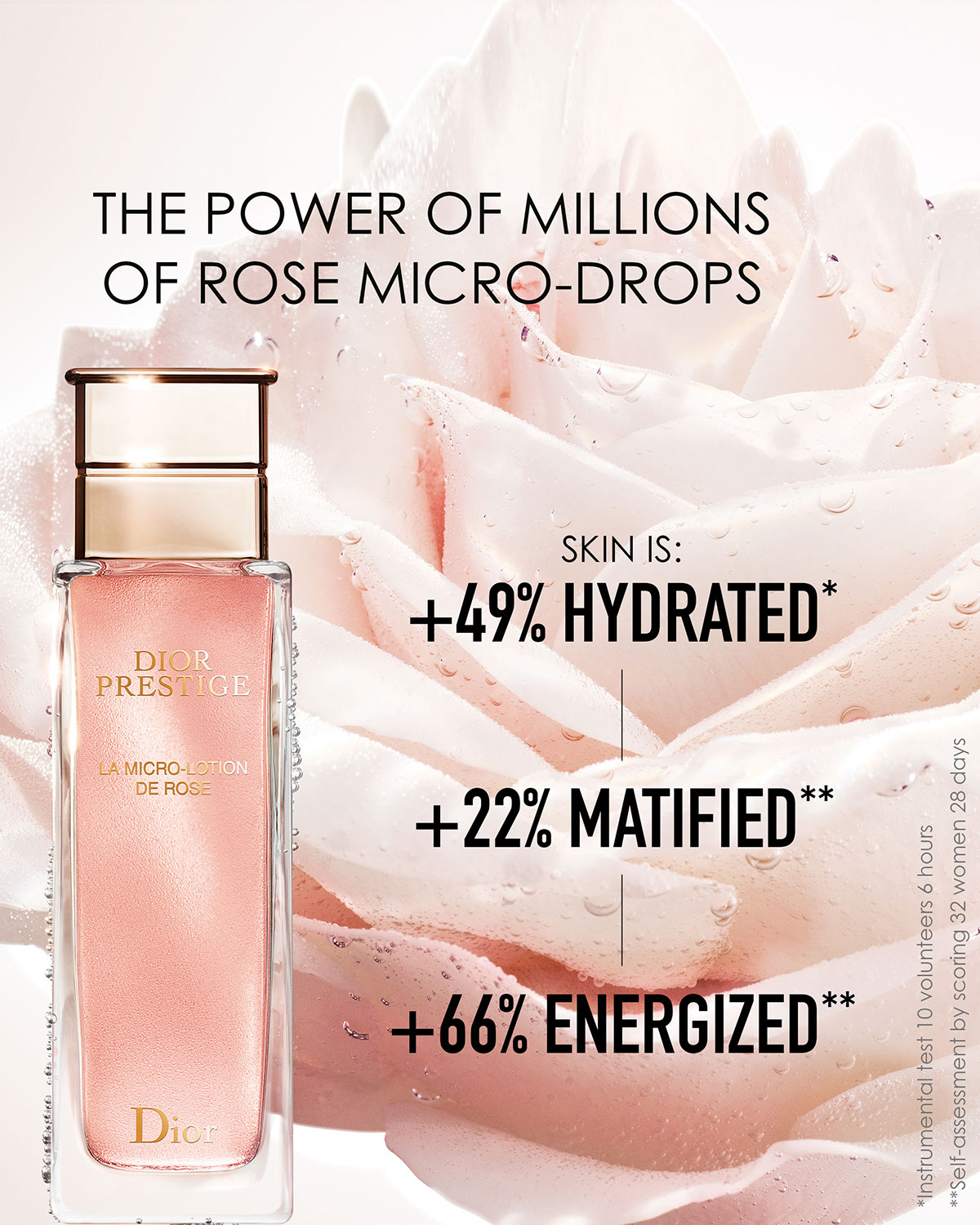 De la Rose de Granville, la Science Dior puise l’exceptionnel pouvoir purifiant de ses minéraux (le zinc, le cuivre et le magnésium) et la richesse de son huile. Un alliage rendu possible grâce à une technologie de micronisation. Sous haute pression, l’huile de rose se fragmente en une myriade de gouttes de la taille du micron, suspendues instantanément au cœur de La Micro-Lotion de Rose.