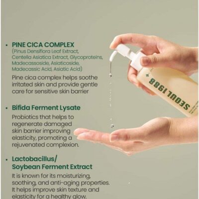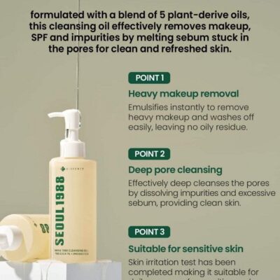 L’huile nettoyante K-Secret Seoul 1988 Pine Cica 1 % aux probiotiques est formulée pour répondre aux problèmes de peau tels que les peaux sensibles, les impuretés, les pores dilatés, le sébum et les points noirs et blancs. Cette huile nettoyante nettoie en profondeur, soigne les pores, purifie, améliore la texture et démaquille efficacement. Elle convient donc à tous les types de peau, en particulier les peaux sensibles et à tendance acnéique.